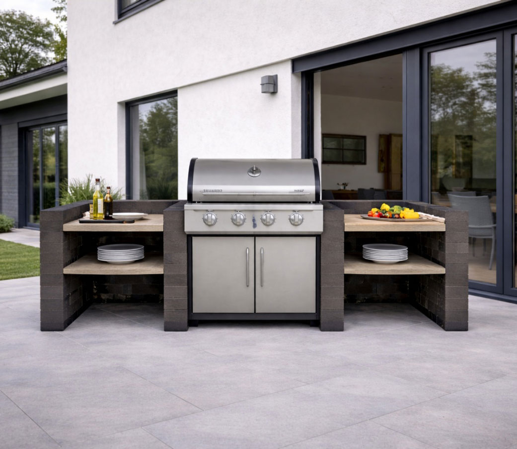 Massive Gartenküche aus echten Klinkern – einfach selbst bauen mit dem HelloBrick System. Die Steine werden ohne Schneiden gestapelt und mit HelloFix verklebt. Die stabile Konstruktion eignet sich perfekt als Grillstation oder Outdoor-Arbeitsfläche.